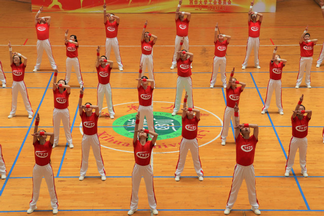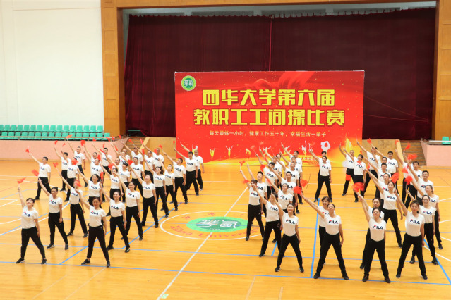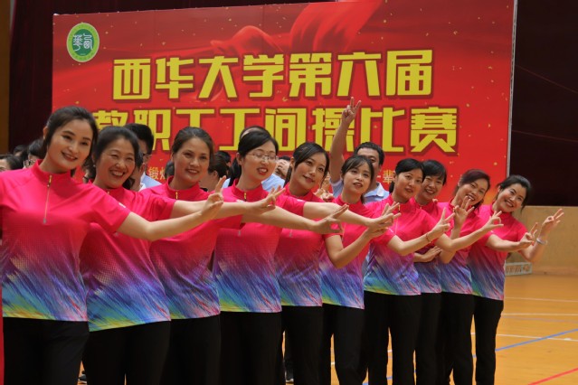 机关工会第一小组的老师们目视前方,屏气凝息,力争每一个动作都做到准确到位;机关工会第五小组的老师们精神抖擞,跟着节拍自信而专注地运动;马克思主义学院的老师们标准的动作令人啧啧赞叹;机械工程学院的老师们每一次伸手都伸得笔直,每一次转身都果断整齐;外国语学院的老师们身轻如燕,活力满满的动作感染了现场的每一个人;机关工会第四小组的老师们淡定从容,伴着音乐顺利完成了整套动作;一声声响亮的口号,一张张甜甜的笑脸,机关工会第三小组的老师们充满活力地完成了比赛;后勤服务总公司高举的“爱国 敬业 团结 友善”宣传板,别出心裁的队形变换,无一不体现出他们为本次比赛付出的辛勤努力;食品与生物工程学院的老师们身着紫色和蓝色上衣,跳出了健康,跳出了活力;灵活协调的四肢,充满热情的笑容,整齐划一的动作,体育学院的老师们尽情展示自己的风采;管理学院用标准的动作、饱满的精气神和他们“管理管理 无与伦比”的口号完美呼应;理学院的老师们一改往日的理性严肃,在体育馆里尽情释放他们的活力;最后出场的计算机与软件工程学院的老师们一袭渐变色短袖同比赛背景板完美组合在一起,他们标准而充满活力的动作也完美契合了本次比赛“健康工作 快乐生活”的主题。