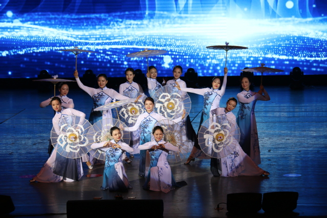 机关分工会和音乐与舞蹈学院带来的《盛世鼓舞》以火热激昂的鼓声拉开了晚会序幕。体育学院带来的诗歌朗诵《中国梦》,字字铿锵,赞美了祖国的锦绣山河;抒心声、展豪情,歌颂伟大祖国,马克思主义学院的诗朗诵《我爱你 中国》赢得了台下热烈的掌声;土木建筑与环境学院、能源与动力工程学院、经济学院的大合唱《歌唱祖国》,唱响了“礼赞新中国、奋进新时代”的昂扬旋律,营造了团结奋进的浓郁氛围。悠悠千古,中华文化博大精深,源远流长,歌舞词曲绘尽千年风雅。琴声缠绵,一曲《梁祝》婉转悠扬,诉尽才子佳人情长;江南雅韵,如丁香花般的姑娘撑着《伞韵》,走过雨中小巷;茉莉花开,姿态古典,舞出《那时花开》的清媚芬芳;大气豪迈的《沙家浜》经典片段,表达了祖国的好山河寸土不让!