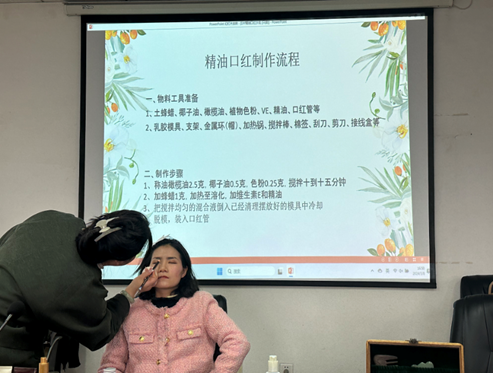 活动在一片欢笑声中拉开帷幕。活动伊始,任老师为到场每一位老师逐一发放了活动需要的材料和工具。然后,按照今天的授课流程,任老师开始对“化妆基础知识讲习”进行讲解。每一位在场的女教职工都听的很认真,并不时用手机进行记录。讲解结束后,现场还邀请一位女老师作为化妆模特给大家现身说法,以便有一个更直观的了解。接下来,就是女老师们翘首以盼的“DIY精油口红制作”环节。女老师们按照任老师讲解的步骤,认真地进行着“艺术创作”。在制作过程中,大家都相互交流着制作心得和技巧,现场温馨融洽、笑语不断,弥漫着精油的芳香,洋溢着幸福的味道,传递着浪漫的气息。活动在温馨、快乐的氛围中圆满结束。大家通过用自己的巧手和智慧,感受DIY精油口红制作艺术的魅力,享受芳香疗愈带来的愉悦,度过了一个难忘的节日。