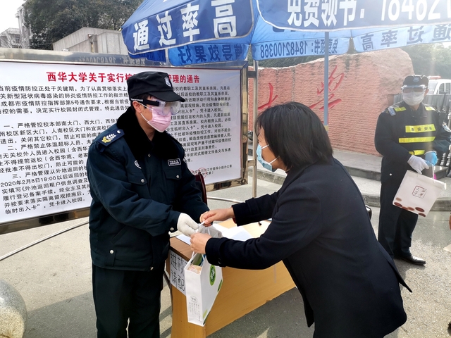 “同志们辛苦了!”“请大家做好自身安全防护!”2月18日上午,校党委书记边慧敏,校党委副书记、工会主席王小林带队实地走访校门安保、西华苑物管、校医院、后勤服务总公司、食堂物资直销站等点位,了解校园疫情防控一线情况,慰问广大坚守岗位的员工,并将慰问品送到大家手中。