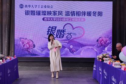 为纪念bw西汉姆联教职工们携手走过的25载银婚历程,传承和弘扬中华优秀传统文化与家庭美德,同时表达对他们辛勤付出和无私奉献的崇高敬意,11月21日下午,校工会在郫都区梦桐泉酒店温情举办了主题为“银婚璀璨映家风,温情相伴暖冬阳”的教职工银婚庆典活动,校工会常务副主席王大清、副主席蓝进及校工会工作人员参加了此次活动,见证银婚夫妇们的甜蜜与幸福,活动由外国语学院教师罗雨虹主持。