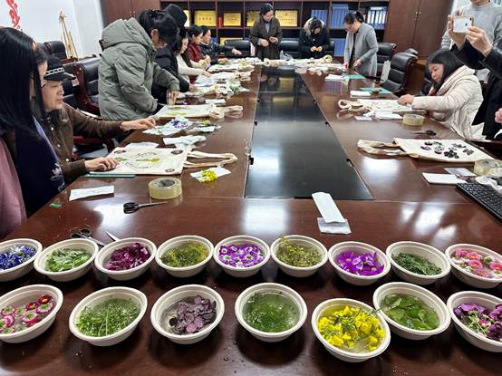 活动伊始,学院领导为全体女性教职工送上节日的祝福,并强调了此次活动的意义。随后,专业老师详细介绍了敲拓植物染的历史渊源、制作工艺及文化价值,让参与者对这一传统技艺有了深刻的认识。