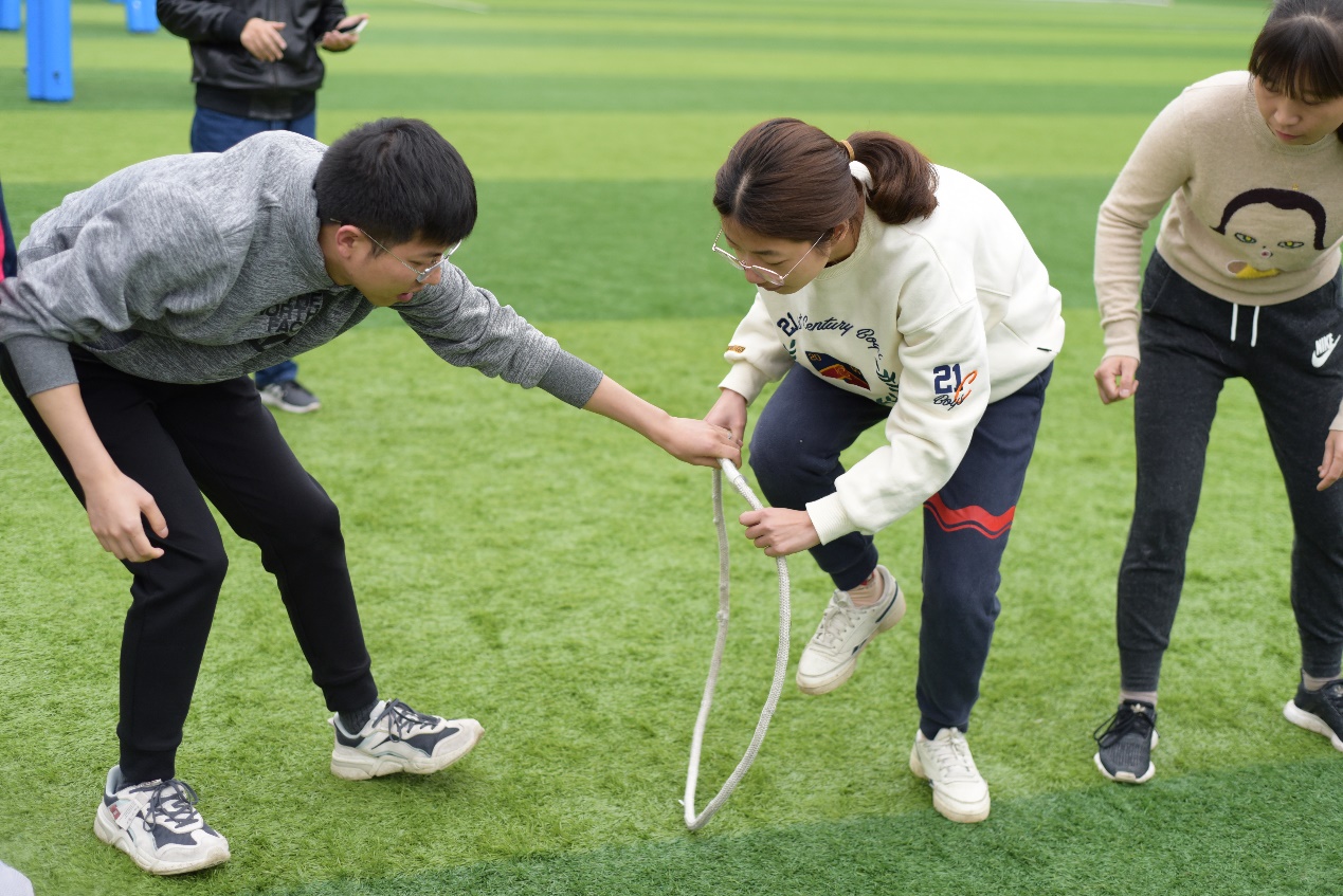 上午9点,教师们陆续到场,在操场上做着热身运动,即使天气欠佳,场地有些湿滑,但老师们仍有高昂的热情,草坪上笑声不断。上午的比赛项目有“金龙钻圈”“流水乒乓”“超级飞镖”,参加“流水乒乓”的老师们格外忙碌,他们每人拿一片轨道,依秩序排列接力向前接通轨道,让乒乓球在轨道内滚动向前,最后一名队员将乒乓球滚入终点的杯中,从起点到终点距离30米,老师们要保证乒乓球在前进过程中不掉地上,如果乒乓球掉地上,必须停止前进,重新放上乒乓球再次前进。老师们齐心协力,在不懈努力下顺利完成了比赛。现场热闹非凡,体育学院分工会和学生会成员在维持现场秩序的同时,也在为老师们服务。