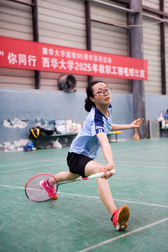 整个比赛过程紧张激烈,精彩纷呈,充分展现了自强不息、知难而进的西华精神。赛场上,平日里辛勤耕耘的教职工们,纷纷化身活力四射的羽毛球运动员。他们步伐灵活,身手矫健,或精准劈吊,或大力扣杀,或默契配合,将高远球、劈杀、吊球、网前小球等羽球技巧展现的淋漓尽致。由16片羽毛组成的白色羽球,在每一片球场上空划出一道道优美的弧线,每一次的精彩回合,都引来观众们的阵阵喝彩。