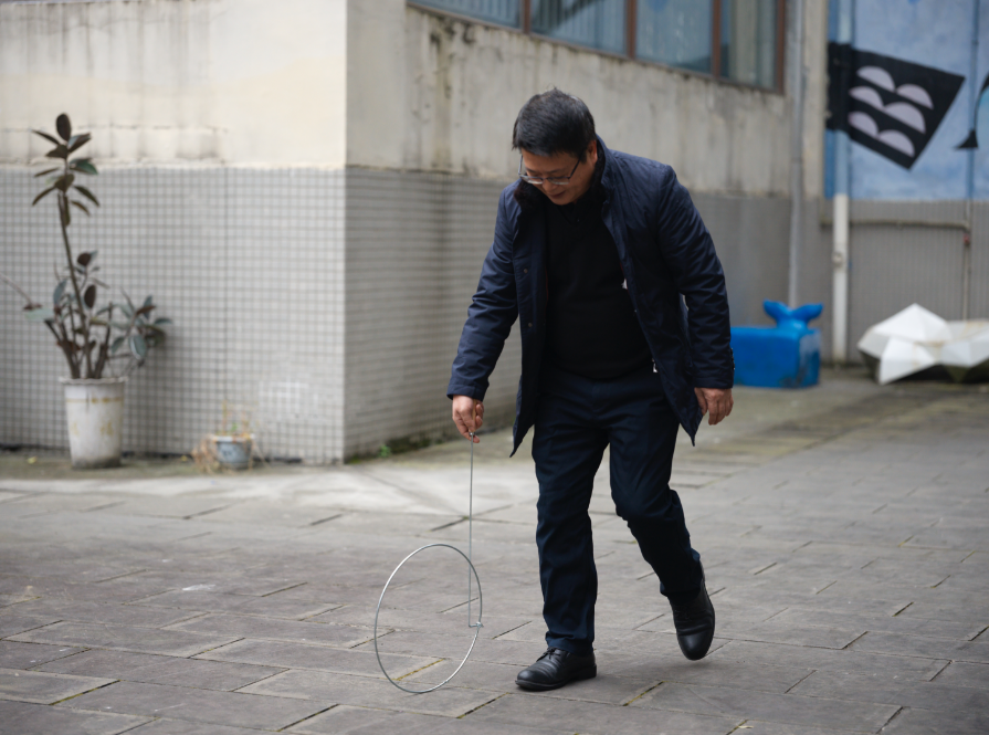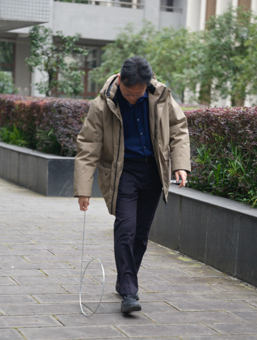比赛前,由学院工会文体委员杨科首先进行了示范,即使用标准铁环与推钩,从起点出发,控制铁环绕过休息区中央的水池一周,并返回起点,全程保持铁环不倒、路线合规方为成功。这不仅考验选手的手眼协调、身体平衡与控环技巧,更增添了绕障行驶的趣味性与挑战性。