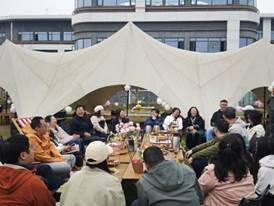 接下来,围炉煮茶环节温馨开启。陈皮白茶、红茶、玫瑰桂花烤奶香气袅袅,搭配时令水果、甜品与干果,老师们在帐篷区品茗聊天,惬意非常。学院领导和老教授分别与青年教师座谈,了解青年教师在工作、科研和生活中面临的困难和挑战,并作为“青椒”知心人,为大家提出了许多过来人的意见和建议。