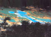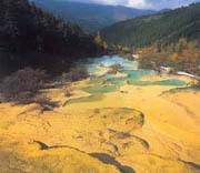 在终年积雪的岷山主峰雪宝鼎下,海拔3145-3578米之间,一条长3.6公里的金色钙华体滚滚而下,宛如一条金色巨龙从莽莽原始森林中奔腾而出,这就是"黄龙";钙华体上,层层彩池(达3400余个)莹红漾绿,道道梯瀑,写翠流金,条条钙滩,飞珠溅玉,异彩纷呈,构成了绚丽奇绝的奇幻景观,有"人间瑶池"之誉,是世界上最壮观的钙华奇观。