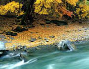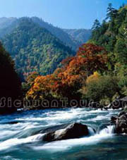 三千三百道沟,三千三百道梁,沟沟有红叶,沟沟有融雪,沟沟有泉涌。山被红叶遮掩,水被红叶浸染,道被红叶铺成,一簇簇、一团团燃成米亚罗秋的火焰。雪山,温泉,森林,红叶,藏羌文化,构成一个神奇的红色梦幻走廊。