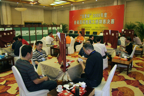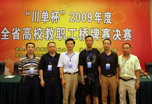 由四川省教科文卫工会主办,宜宾学院工会承办,四川农业大学工会、四川川单种业有限责任公司协办的“川单杯”2009年度全省高校教职工桥牌赛决赛于7月21日至23日在宜宾市举行。我校由学校党委副书记王民朴同志领队,学校工会常务副主席王代言和副主席杨晓龙为工会负责人,李跃平、蒋明礼、凌廷友、尹良四位教师为选手代表学校参加了比赛。