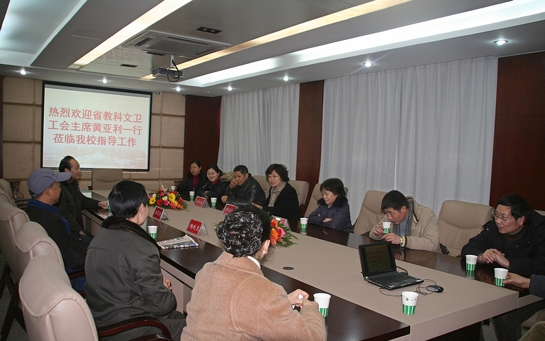 王民朴向黄亚利一行介绍了我校工会的工作思路及工作开展情况,特别是在学校民主管理、二级教代会、经济适用房建设等方面发挥的重要作用。他说校工会将以今年3月教职工代表大会和工会会员代表大会召开为契机,以制度建设为抓手,以二级教代会建设为重点,进一步加强组织建设,开创工会工作新局面,促进工会、教代会的规范化建设与发展,在学校民生工程建设中加强工会话语权,进一步提升工会形象,进一步发挥工会在民主治校依法治校中的作用。王代言就我校今年3月即将举行的“双代会”筹备情况作了汇报。