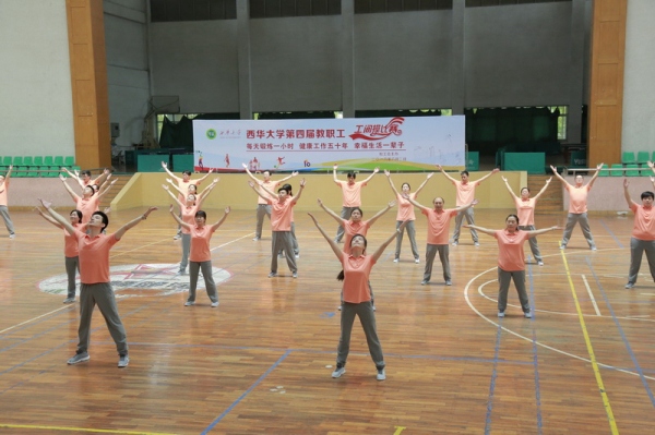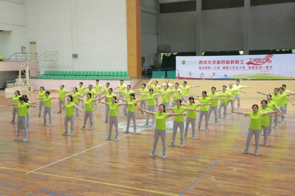 告别五月清凉的微风,迎着六月灿烂的阳光,6月2日下午,由校工会主办的第四届教职工间操比赛在体育馆内如期举行。本次比赛以分工会为单位,包括机关二分工会、机关三分工会、图书馆分工会以及各学院分工会在内的15支队伍参加了比赛,最终,机关三分工会获得冠军,计算机与软件工程学院工会获亚军,艺术学院工会获季军。
