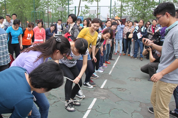 “第一棒,预备――砰!”随着一声信号枪响,紧张而激烈的迎面接力赛拉开了教职工趣味运动会的序幕。4月20日,我校第38届教职工趣味运动会在临江苑操场举行,全校教职工踊跃参与了跳远、铅球、金龙钻圈、集体跳绳、迎面接力、定点发排球和投篮等项目比赛。