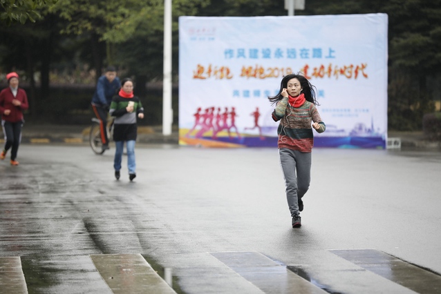 下午2点,运动员们就早早聚集在长跑起跑点周围,不畏严寒,精神饱满地开始了热身运动。2点30分,随着发令员的一声枪响,女子青年组队员们奋力冲出起跑线,拉开了比赛的序幕。比赛虽时值寒冬,天空下着细雨,但挡不住教职工高涨的热情。“跑健康未来,展西华风采”、“燃烧吧我的卡路里 西华全员跑起来”……沿途的标语感染着每一位运动员,长长的跑步队伍在冬日的校园里形成了一道别样的风景。运动员们你追我赶,冬日的校园里因有这群健康、积极、朝气蓬勃的西华人而显得更加美丽。老师们的积极参与也激起了学生们的热情,围观的同学们争相为自己的老师助威加油。