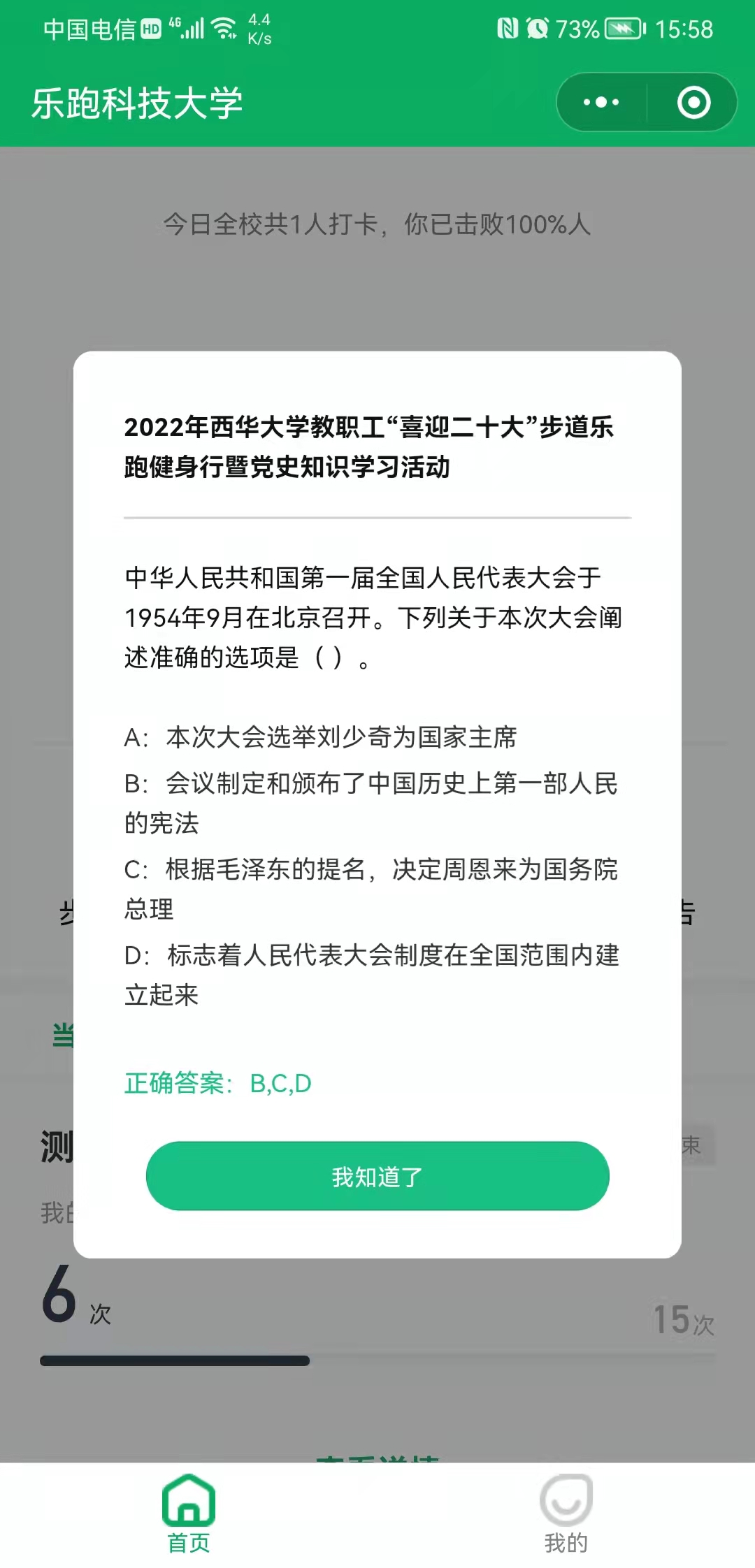 3.提交成功后,每次打开小程序,会出现党史知识学习界面,阅读后点击“我知道了”,会自动上传当天最新微信步数,至少每周打开一次进行步数同步,同时可查看当前活动完成情况。