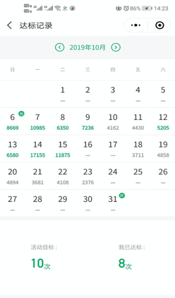3.活动要求:以天为单位统计步数,当天累计8000步及以上算一次有效运动。活动期内,累计有效运动达100次即为完成活动目标。